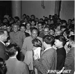 这是1956年9月27日,大会胜利闭幕,毛泽东步出会场时,受到大会代表和工作人员们的热烈欢迎(资料照片)。