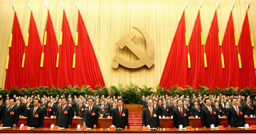 雄伟的人民大会堂大礼堂,气氛隆重热烈。主席台上方悬挂着“中国共产党第十七次全国代表大会”的会标,后幕正中是镰刀和锤头组成的党徽,10面鲜艳的红旗分列两侧。二楼和三楼的眺台上分别悬挂着“高举中国特色社会主义伟大旗帜,以邓小平理论和‘三个代表’重要思想为指导,深入贯彻落实科学发展观,为夺取全面建设小康社会新胜利而奋斗!”“伟大、光荣、正确的中国共产党万岁!”的横幅。